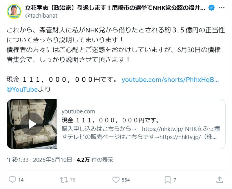 尊師・立花孝志は3億5000万円の借金について説明するらしい(引用元リンク)