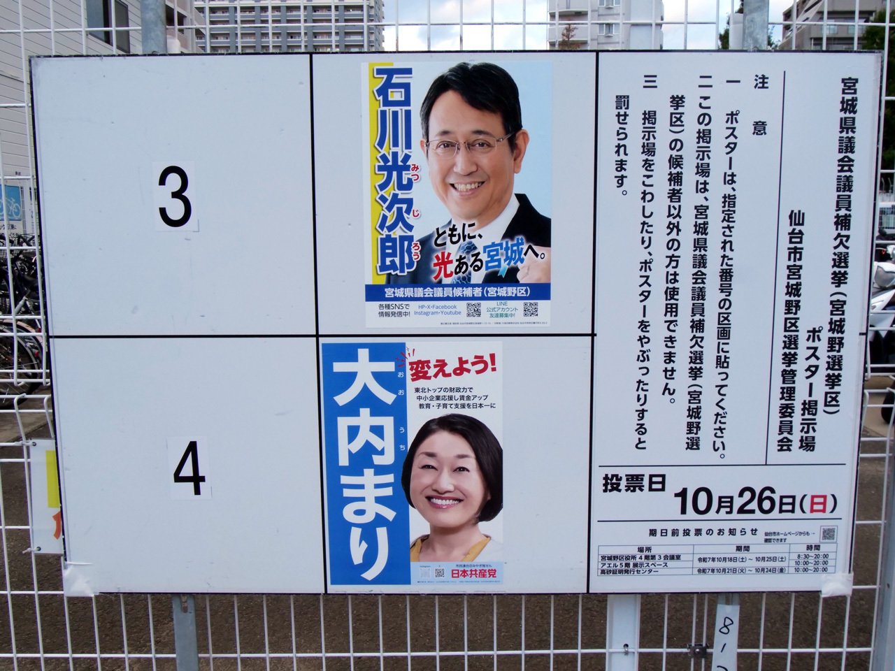 10月17日告示、10月26日投票で、宮城県議補選が行われました。
