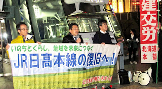 横断幕の前に立って「私もよく日高には行ってるよ。鉄道は残さなきゃダメだ」と話された男性は、ある大学の先生。鉄道を残す気のない国会議員を減らせばお金はできると、語り始めたら止まらないほど今の政治に腹が立っている様子でした。マイクを握った私からは、民間英語試験の問題にも触れて「動かす力は市民の声です」と呼びかけました。