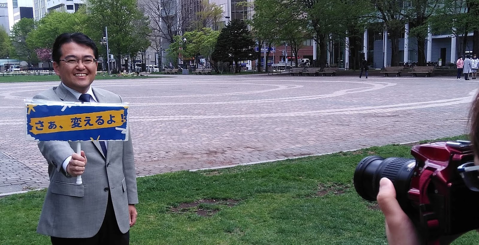宣伝やSNS用の撮影で札幌中心部をまわると、桜の開花に興味津々な外国人観光客が、私の撮影中にも親指をあげてGood! 私が予定候補なんてわからないでしょうね。