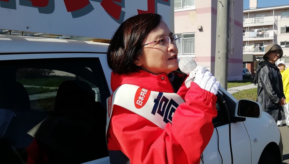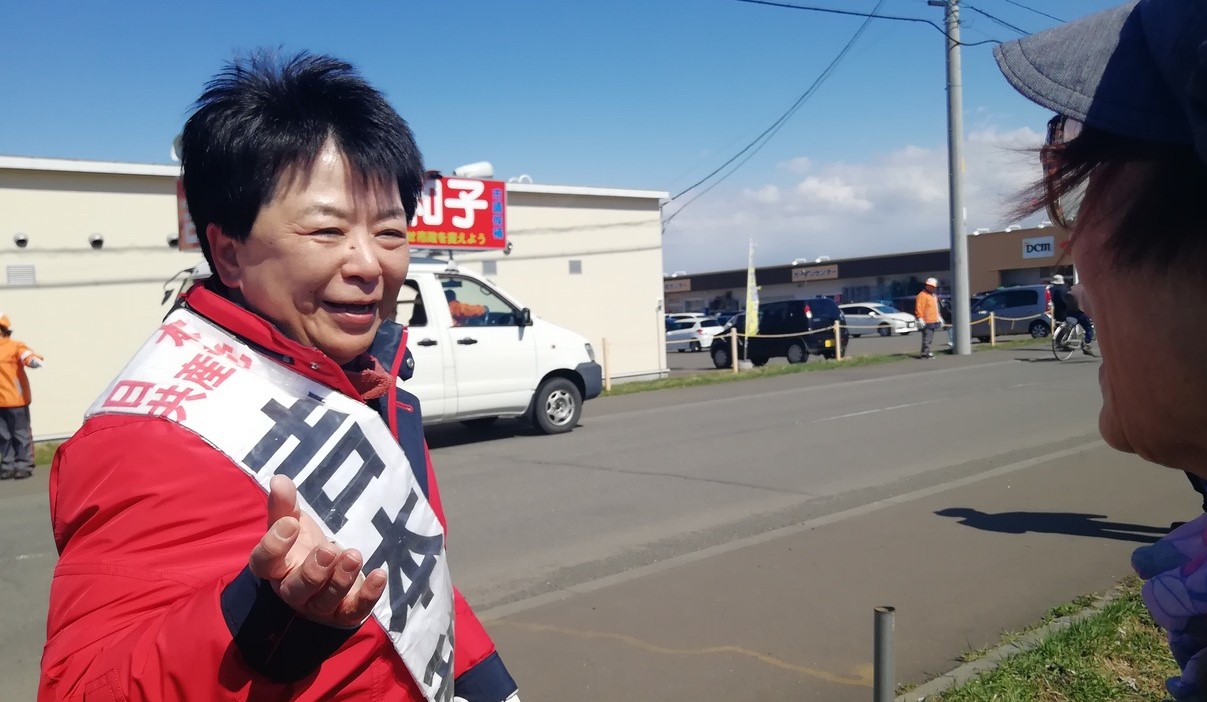 88自治体から131人の候補者がいる北海道(※無投票当選を含む)。直接まわれなかった候補の必勝を願いつつ、ここも激戦となっている江別市に。高橋典子・吉本和子の両現職と、新人・佐藤みさ子候補とで改選比1増となる3議席をめざします。女性候補者が多い江別市ですが、高橋典子候補も最初は中学生と小学生の子どもを抱えて議会活動をしていただけに、5期20年もの奮闘が大きな功績となって反映してきた結果ではないでしょうか。就学援助の入学準備金を3月支給にするなど、子育ての支援では確かな実績も積み重ねてきました。行動力と論戦力で、江別市議団のカナメとなってきた高橋候補を押し上げてほしいと私も力を込めました。