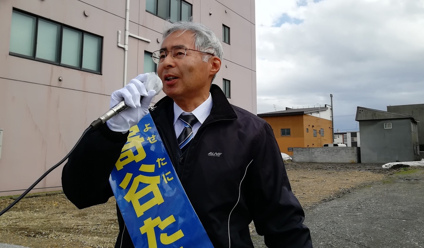 滝川市では、新人・よせたに猛男候補が懸命の訴え。製造業の工場長を務め、いっしょに汗を流したよせたに候補は誠実そのものというべき方。スキー指導員も10年勤めて、特に子どもたちには体も心も健やかに育つようにと親身に寄り添ってきました。その人柄を知れば、誰もが応援したくなる候補なのです。