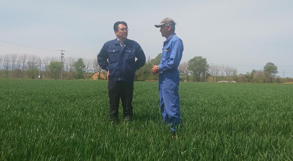 ちょうど畑は秋まき小麦が青々と育っていました。昨年は低温・長雨の影響もあって作況が悪かっただけに、よい天気が続いている今年への期待も大きい。「でも『青田を喜ぶな』という言葉があるんだよ」と教えてもらいました。収穫の直前まで何が起こるかわからない。自然を相手にした農業の重みを、あらためて知る懇談ともなりました。