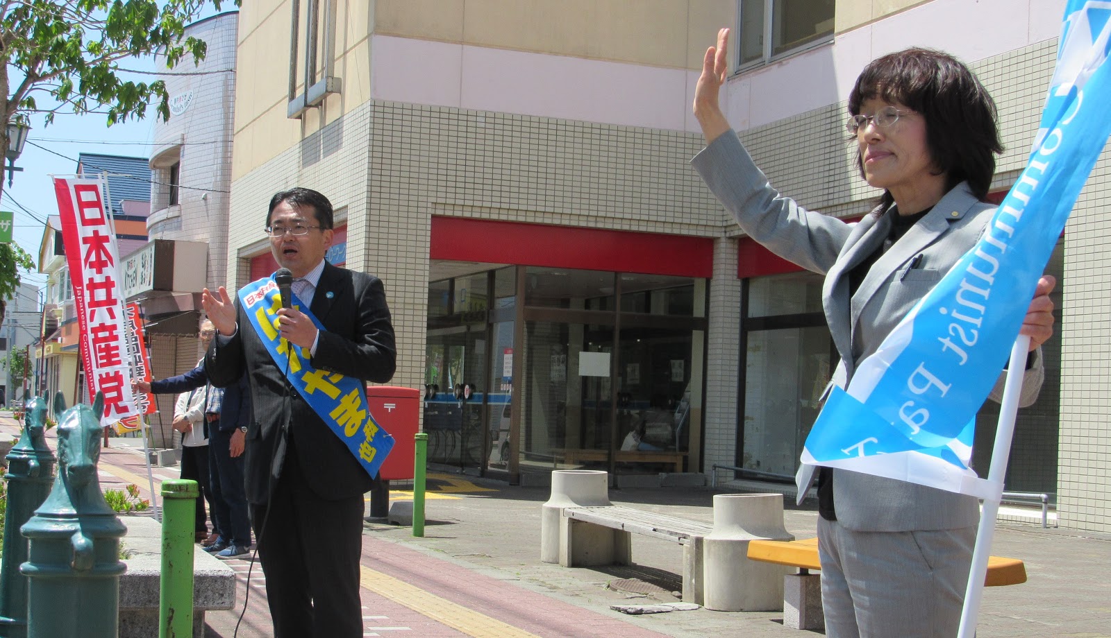 今日もいい天気でしたので、手を振って応えてくださる方もチラホラと。演説箇所には党員・支持者のみなさんも来てくださって、たくさんの激励もいただきました。新ひだか町では谷園子町議、新冠町では前町議の武藤勝圀さんが、いっしょに回ってくださいました。地域に根ざした議員・前議員さんだけに心強い。日高管内は、どの町も軽種馬生産が大事な基幹産業です。少し中心街を離れると、馬の親子を牧草地で目にします。大きな音に驚いて走り出し、骨を折るようなことがあっては大損害なので、近くを走る時は宣伝カーも音を控える配慮をしています。日高地域特有の事情ですね。