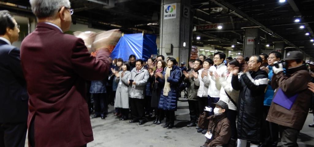 今年の豊漁・豊作と商売繁盛を願って、札幌卸売市場で初競り式! 紙智子・岩渕友の両参議院議員と参加し、あいさつに市場内もまわりました。昨年は水産も青果も売り上げが若干下がりましたが、今年は盛り返したいですね。そのためにも個人消費の引き上げへ、そのためにも消費税減税を。まわった先で「今年は共産党の年だね」「がんばってよ」と声もかけていただきました。ある女性とは「戦争のない国にしてほしいよ」と、店先でしばし懇談。慌ただしい早朝でも、いろんな願いを聞かせていただきました。