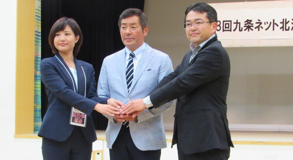 今日は憲法9条を守る野党3人の予定候補が、九条ネットの交流集会でそろいました。報道関係も多く、がっちり3人で握手も交わしました。