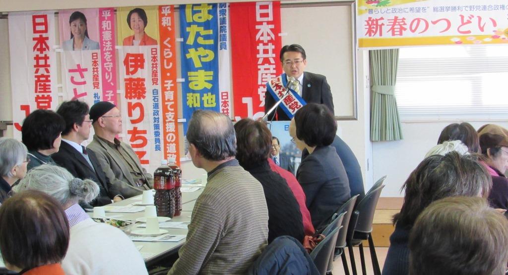 江別市は昨年の市議選で3議席に回復(吉本和子・高橋典子・佐藤美佐子)して、3人の議員とともに新年の決意を私からも述べました。市議会の議員構成が変わり、意見書が採択されたことの喜びも語られました。こつこつと地域から動かすことで、変化は生まれていくものなんですね。