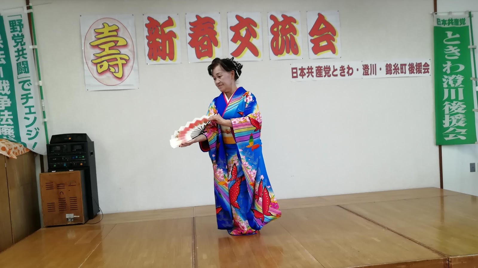 ミニ講演と称して30分の時間までいただき、安倍政権をどう変えるかや若い世代の変化、党大会の様子なども話をさせていただきました。小野寺幸恵市議団長や、いっしょに党大会に代議員として参加した森本健太さんもあいさつされて、みんなで今年もがんばろう!と意気高いつどいになりました。手作りおしるこなどもおいしかったし、舞台企画では日本舞踊の加藤宣子さんの振袖が何とレインボー! 写真でわかるでしょうか。多様性を認め合い、1人ひとりの尊厳を大切にする日本にしようという党の決意を先どって示してくれたようで、ここでも嬉しい出会いの場となりました。
