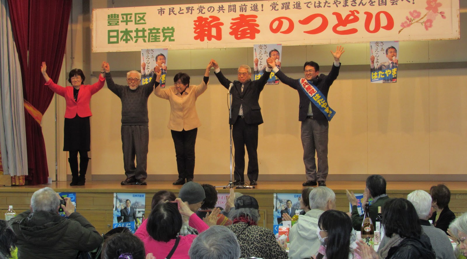 札幌市豊平区では、琴紫会のみなさんによるお筝と尺八の演奏からスタート。お筝は小学生と17歳の4人でしたが、聞き入ってしまうほどの見事な演奏にビックリ。参加者からも大きな拍手が湧いていましたよ。文化・伝統の企画があるのも、日本共産党の「新春のつどい」ならではです。来賓として「戦争させない市民の風・北海道」から山口たか共同代表からあいさつをいただき、お越しくださった平和憲法を守る豊平区民の会の西村弘行さんなどと並んで「がんばろう」と手をつなぎました。こういう流れが当たり前のような光景になってきましたが、多くの方の努力の積み重ねによるものなんだと再確認です。