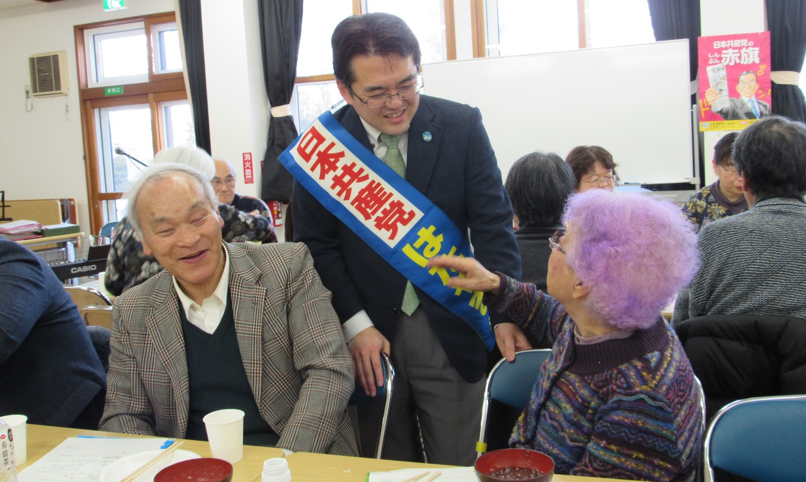 教員としてお世話になった苫小牧市。つどいのなかで「●●の母です」との声がかかり「先生のことを応援してると言ってましたよ」との一言もいただきました。うれしいですね。というのも今日ひらかれた「新春のつどい」は、ときわ・澄川・錦糸町後援会が主催したもので、その後援会長も私が教員のときの同僚の先輩先生。写真の左に映っている竹田先生なのですが、将棋という共通の趣味もあり、よく自宅にまで押しかけて将棋を指していた間柄でもあったのです。このような縁もあってか、教え子のお母さんが駆けつけてくださっていたんですね。
