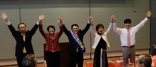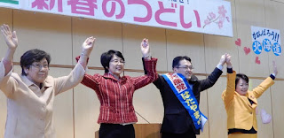 今日は札幌市清田区・厚別区・東区の「新春のつどい」に全道労働者後援会の会議へと、まさに分刻み。語り合う時間を持てないのは残念ですが、どこでも激励をいただきありがたい限りです。札幌市の3区は紙智子参議院議員とで、いっしょにまわりました。そういうわけで写真が中心の内容で申し訳ありません。清田区では昨日に続き「戦争させない市民の風・北海道」共同代表の山口たかさんと吉岡弘子市議、厚別区では村上仁市議と川部竜二党白石・厚別地区委員長、東区では宮川潤道議・太田秀子市議・平岡大介前市議とで手をつなぎ、がんばるぞとの思いも固め合いました。全道労働者後援会は(写真が了解の方のみですが)参加者そろって力を込めました。