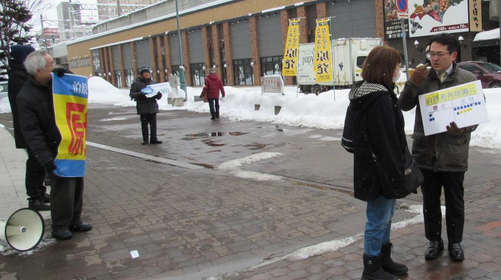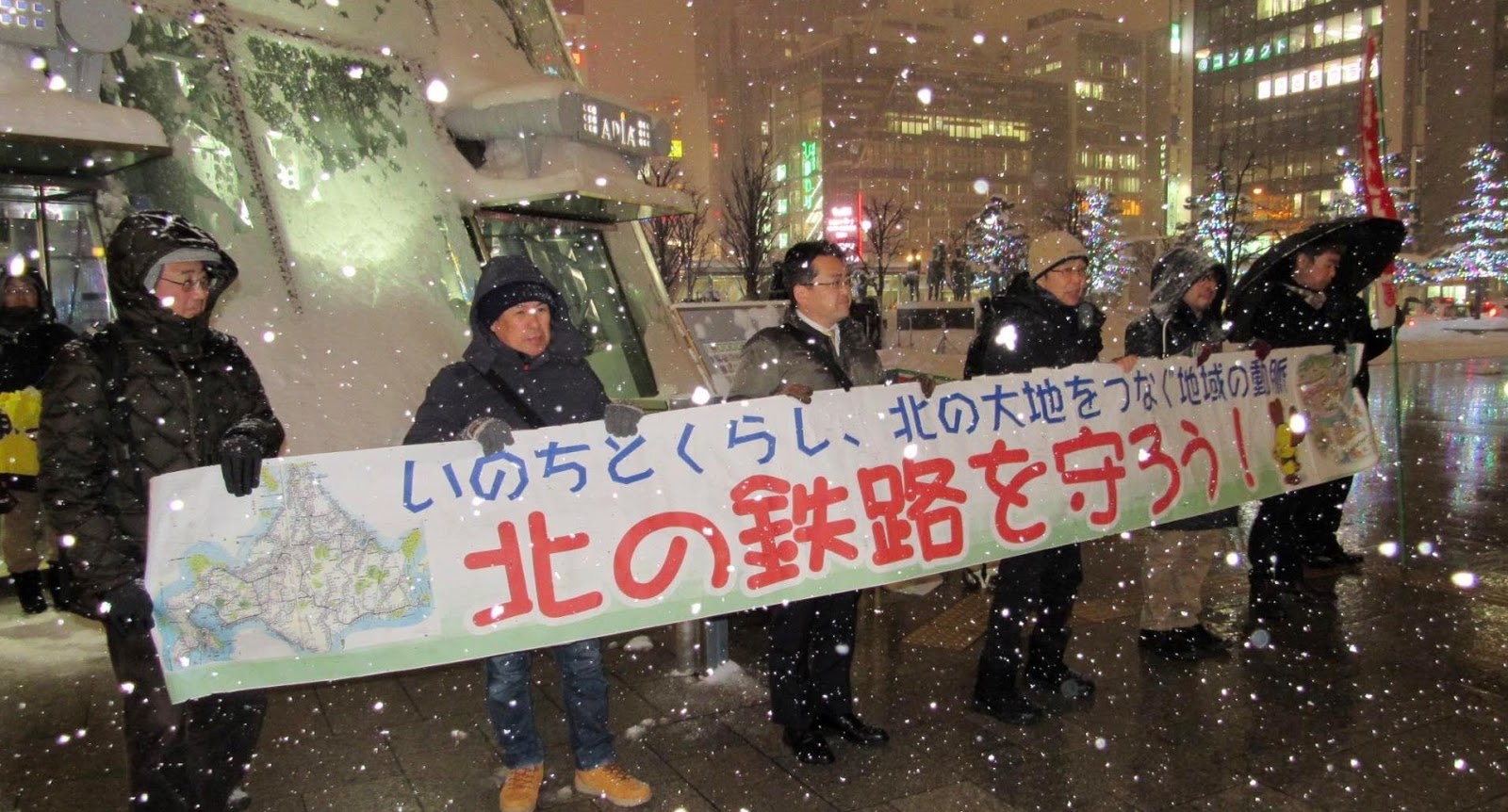 夕方は「北の鉄路存続を求める会」の宣伝と「いちの日」行動。あいにくの雪でしたが、10年ほど前の「いちの日」行動ではこれ以上の降り方だったことを私が話すと、国鉄闘争を経験してきたSさんからは「今年で『いちの日』行動も30年目となりました」とも。これほどの雪には負けられないんですね。あらためて「いちの日」行動の歴史の重みをも実感しました。