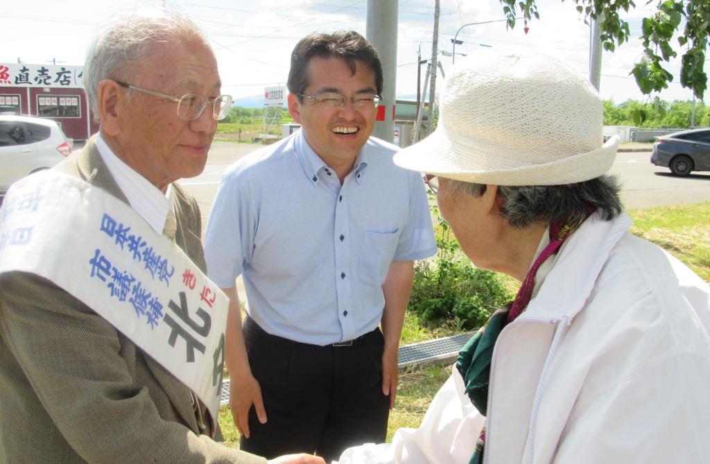 けんじろうさんは、市民との運動を大事にして南美唄地域の共同浴場廃止をストップさせるなど、1期目ながら大活躍。よく勉強もされていて、これからの美唄を切り拓く若い力として期待されているのです。頼れる2人を何としても市議会へ再び送ってほしいと、私も心を込めて呼びかけました。頼りになるという点では、深川市の北名照美候補はピカイチです。9期の実績と市長選挙にも推されて立候補するなど市民からの信頼も厚く、今回の再登板となりました。市発注の小学校改築工事をめぐる官製談合事件があり、当時の市議会で追及の先頭に立ってきたのが北名候補だったのです。