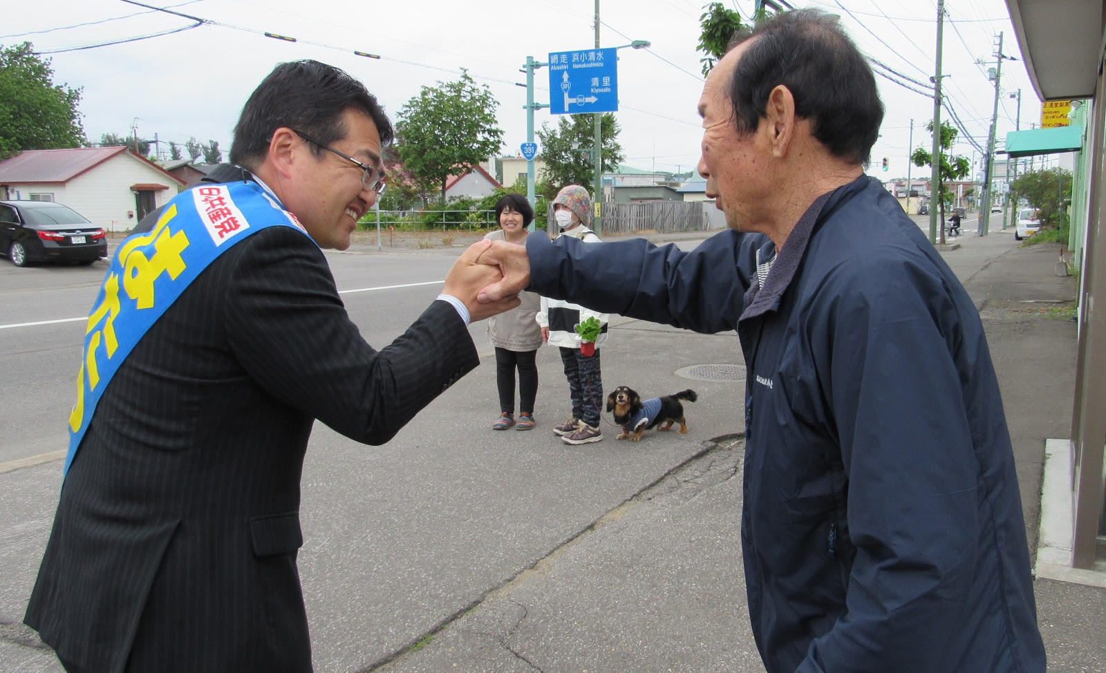 JAこしみずに表敬で訪れてからは宣伝にまわりました。清里町では街宣カーでまわっていた立憲民主党の勝部けんじさんともバッタリ! お互いにエールを交わしました。
