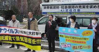 4月1日は消費税導入の日。毎年おこなっている消費税廃止各界連絡会の宣伝ですが、今年は町を歩く人の姿もやや少なめです。とはいえ足を止めて話を聞く方の姿もあり、「今こそ消費税減税を」という思いが広がっていると感じました。1989年当時、私は高校3年生。食堂を営む親からの頼みで、メニューの値段をワープロで直す手伝いをしていました。ところが当時の消費税は3%ですから端数が出ます(例えば550円→566.5円)。端数を切り上げれば便乗値上げになりかねないし、切り下げたらわが家の持ち出しになります。結局どうしたかは忘れましたが、おかしな税金だなと思ったものでした。