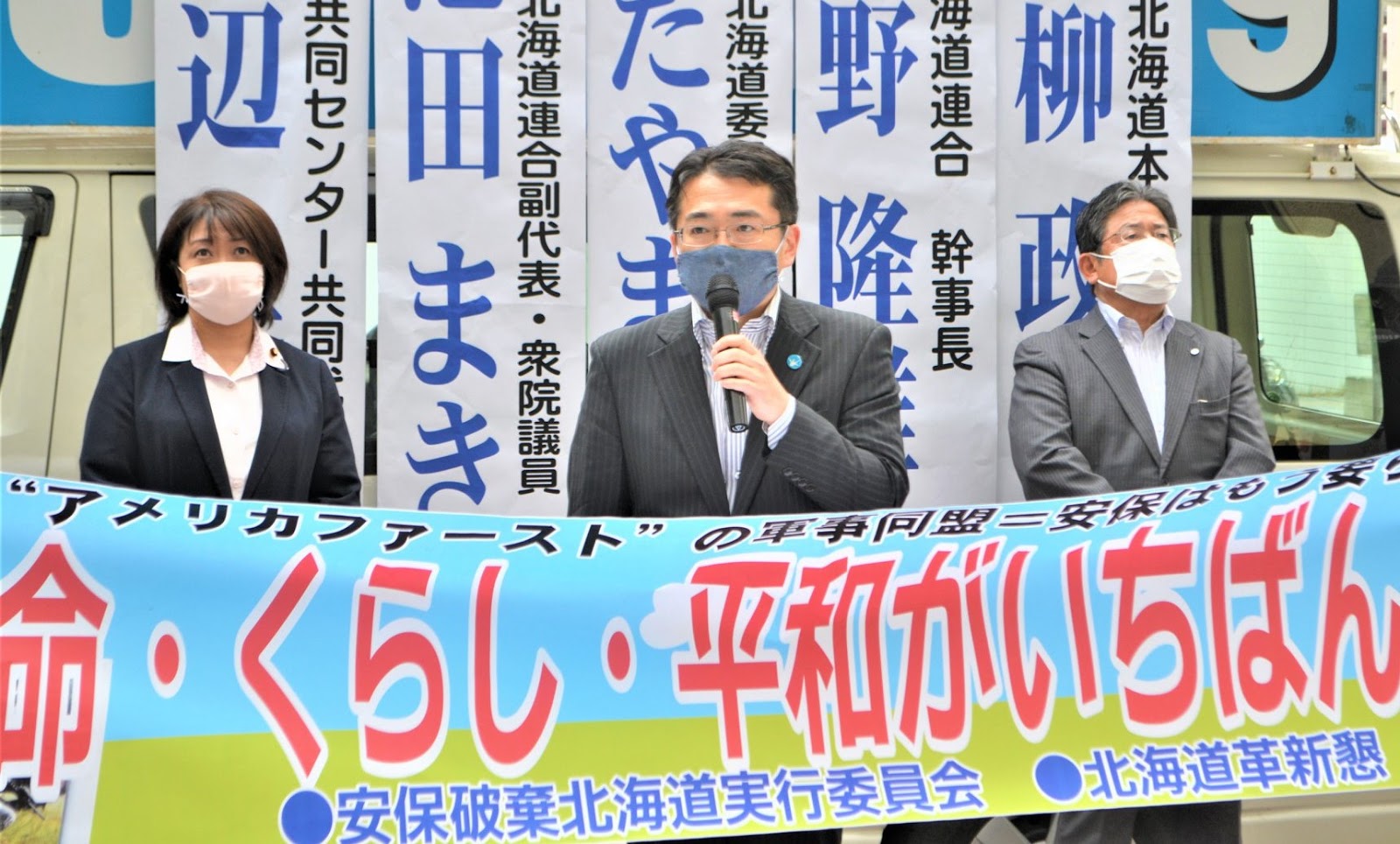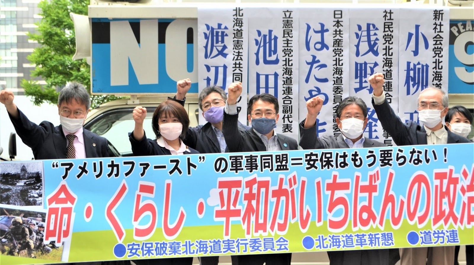 日米安保条約改定から60年、もう「米国いいなり」やめよう。札幌駅前の街頭行動に、立憲民主・社民・新社会・日本共産党が集まりました。立憲は池田真紀衆議院議員、社民は浅野隆雄道連幹事長、新社会は小柳政行道本部書記長、日本共産党は私とでマイクを握りました。主催は安保破棄道実行委員会/道革新懇/道労連です。日米安保条約をテーマに各党が集まるというのは、最近の共闘の場面でも、なかなかなかったことです。ただでさえ米国に従属的な安倍政権が、トランプ大統領の就任以来さらに「米国いいなり」という状況が広がっています。沖縄の辺野古新基地建設しかり、米国製戦闘機などの「爆買い」しかり、新しい日米貿易協定しかり、です。