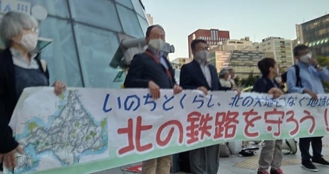 先立つ「北の鉄路存続を求める会」の宣伝は、「JR日高線を守る会」地脇聖孝さん、留萌本線の沿線自治体から沼田町義・篠原暁さん、「有害掘削土から手稲の水と安全・健康を守る会」共同代表・堀井克幸さんも駆けつけてくださいました。足を止める方、署名に応じる方の姿も多く、注目が集まりました。