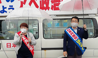 雨が降ったり止んだりの苫小牧市で、松橋ちはる小選挙区9区予定候補と街頭8ヵ所で訴え。早期の解散・総選挙もありうる状況のもと、広い北海道で急いで声を上げていかなければ。