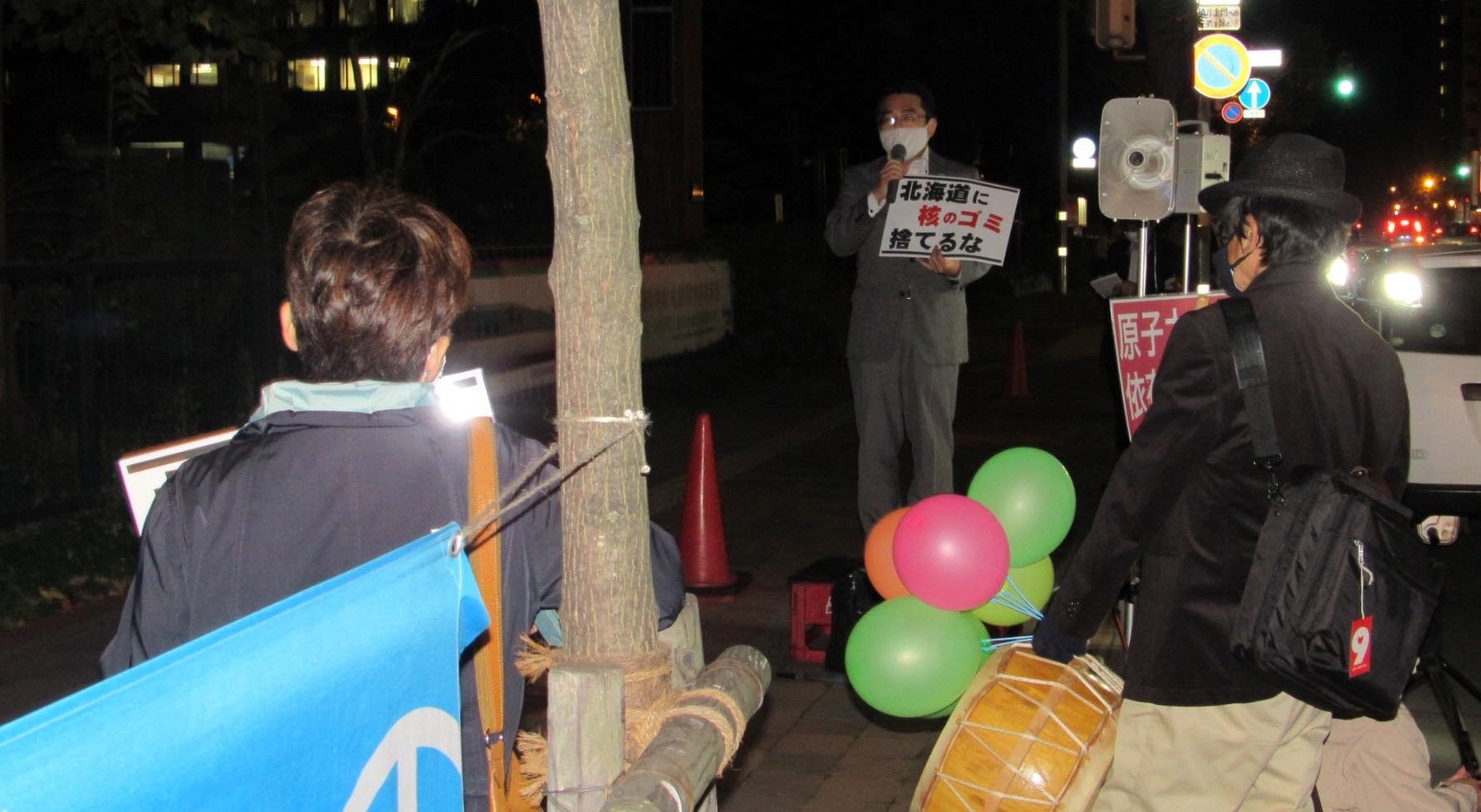 夜の反原発抗議行動でも同じようなスピーチをしましたが、道庁前だけに知事や道職員にも耳を傾けてほしかった。知事から梶山経産相へ、どれだけ突っ込んだ話ができたかはわかりませんが、中途半端な態度にならず「核のゴミは受け入れない」と明確な意思を示してほしい。