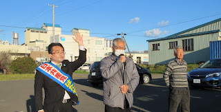 今日は別海町西春別から始まり、浜中町・厚岸町へとまわりました。別海町では中村忠士・瀧川栄子、浜中町では加藤弘二、厚岸町では石澤由紀子の各町議が準備とともに今日もまわってくださいました。昨日に続き石川明美・小選挙区7区予定候補もいっしょで、街頭宣伝や「つどい」で元気に訴えることができました。地域を知る予定候補がいるというのは、とても心強いのです。