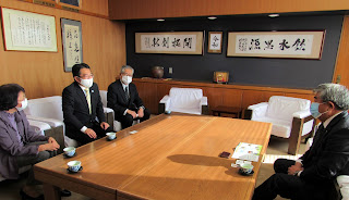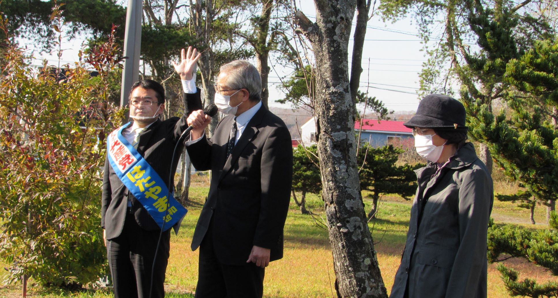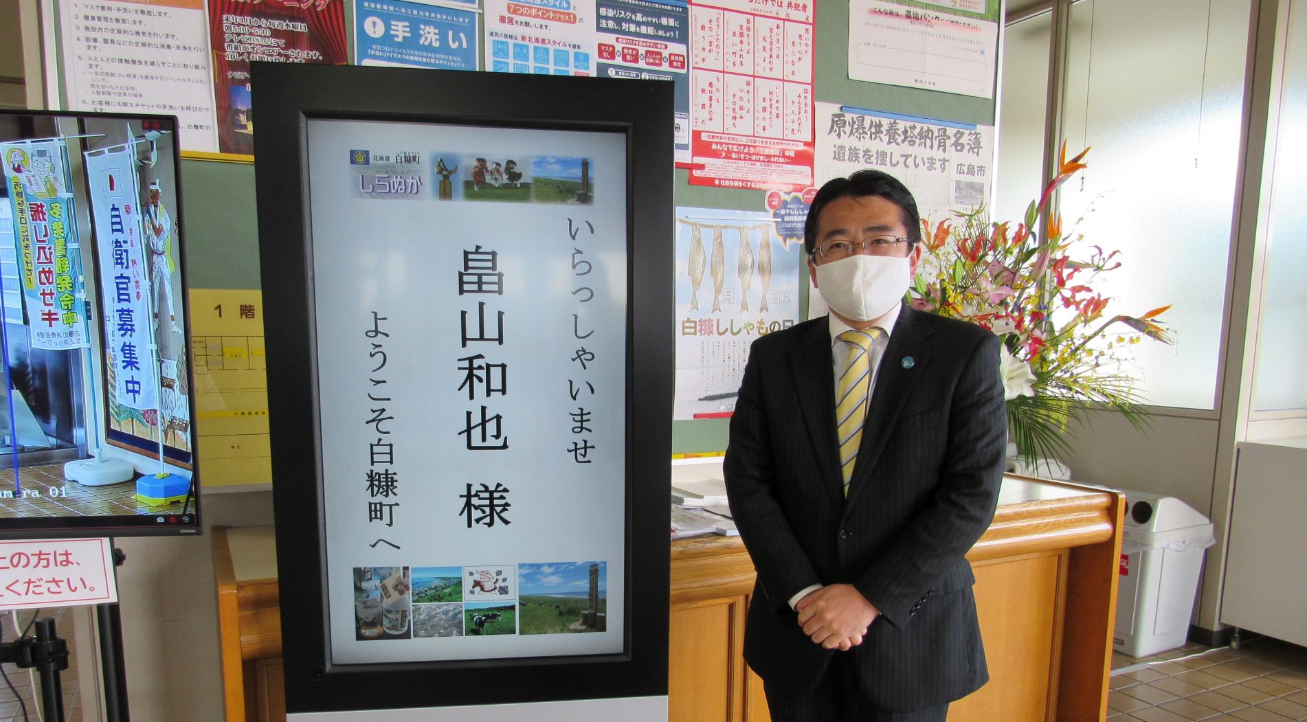 今日は白糠町・棚野孝夫町長への表敬訪問からスタート。町役場に入ってビックリ、体温測定の大ディスプレイの横に、私を歓迎してくださる電子掲示板まで! 恐縮しながら町長室に足を運びました。鎌田民子町議が案内してくださり、今日も石川明美・小選挙区7区予定候補といっしょです。