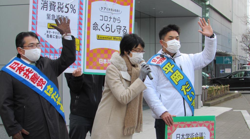 国会から戻ってきた紙智子参議院議員の街頭報告で、平岡だいすけ2区予定候補といっしょにマイクを握りました。コロナ対策では無為無策、学術会議には強権、金権疑惑にはフタをする菅政権に怒っている声が次々と寄せられました。