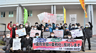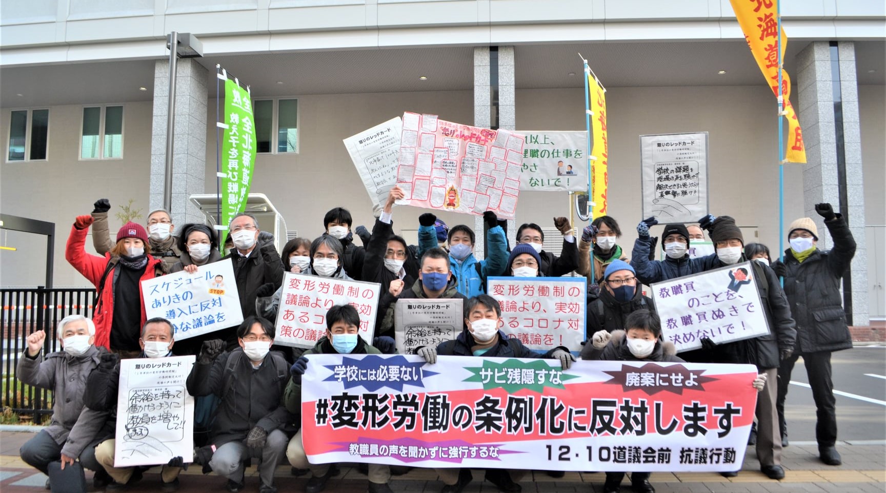 今回の変形労働制は、夏休みなどに休暇をまとめ取りして、平日の労働時間を伸ばそうというもの。今でさえ残業代も出ない超過勤務の不当な現実を、合法化してしまうことになります。そもそもで言えば8時間労働制を壊すもので、民間でも労働者側との合意が必要とされているのに、学校での周知や議論・納得もないまま道教委が全国に先駆けて条例提案したのです。この経過だけ見ても、本当に許されない。