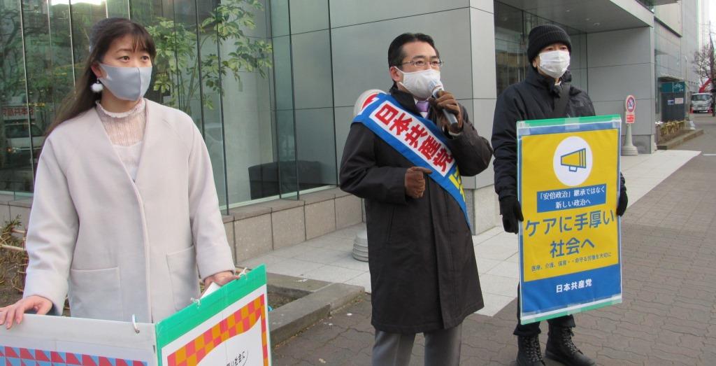 道農民連から参加したのは副委員長の岸本さん、書記長の富沢さん。「政府も食料自給率向上を掲げながら、農産物輸入を見直さないのはおかしい。農家が安心して農業に励めるようにしてほしい」(岸本さん)、「コロナ対策と称した次期作支援金は条件変更がされたため、現場は混乱している」(富沢さん)など、道農政事務所にてまっすぐ訴えました。私からも「切実な要求を受け止めるべき」と迫りました。