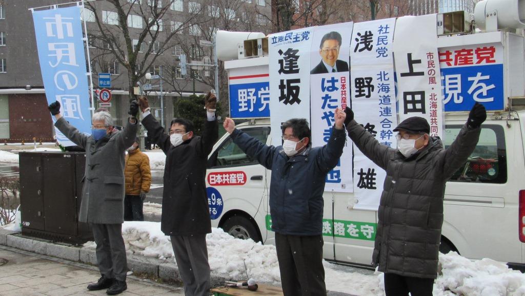 「戦争させない市民の風・北海道」主催による、市民と野党の共同街頭宣伝。道2区補選も控えて多くの方が足を運んでくださり、寒いなかでも熱気が広がりました。立憲民主党は逢坂誠二衆議院議員、社民党は浅野隆雄道副代表、市民の風は上田文雄元札幌市長、そして日本共産党は私がマイクを握りました。