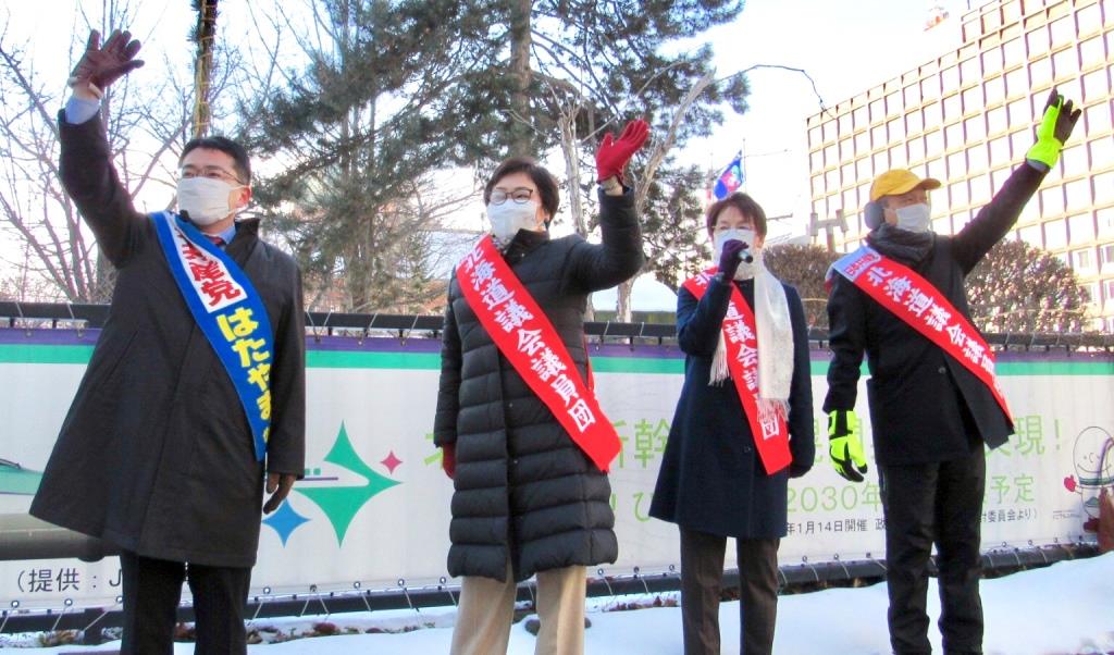 さて、今日から道議会は定例会。真下紀子・菊地葉子・宮川潤の各道議と並んで、朝の宣伝に臨みました。本当はもう1人いれば会派を形成して代表質問ができるのですが、それができない悔しさ。国政でも道政でも、こうやって1議席の重みを痛感するのです。必ず今年おこなわれる衆議院選挙とともに、来年の参議院選挙、再来年の統一地方選挙と右肩上がりの結果を出していきたい。汚いお金にまみれないで、地に足をつけて活動する日本共産党の議席が増えることで必ず政治は変わります。