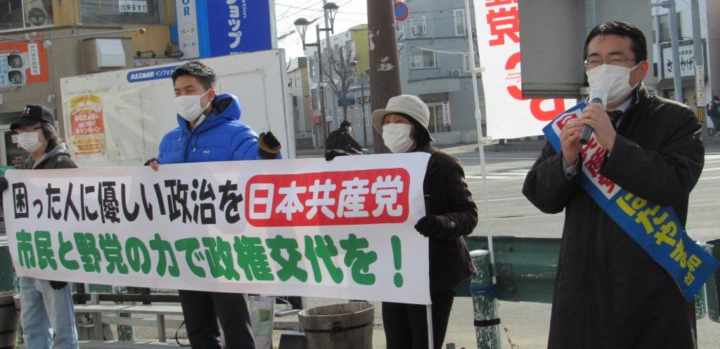 今日は朝の街頭宣伝から終日、札幌北区へ。道2区補選では松木けんこうさんを野党統一候補としてたたかうことを、私からも話してまわりました。立候補をとりやめた平岡だいすけさんも、朝の宣伝では元気にあいさつされました。