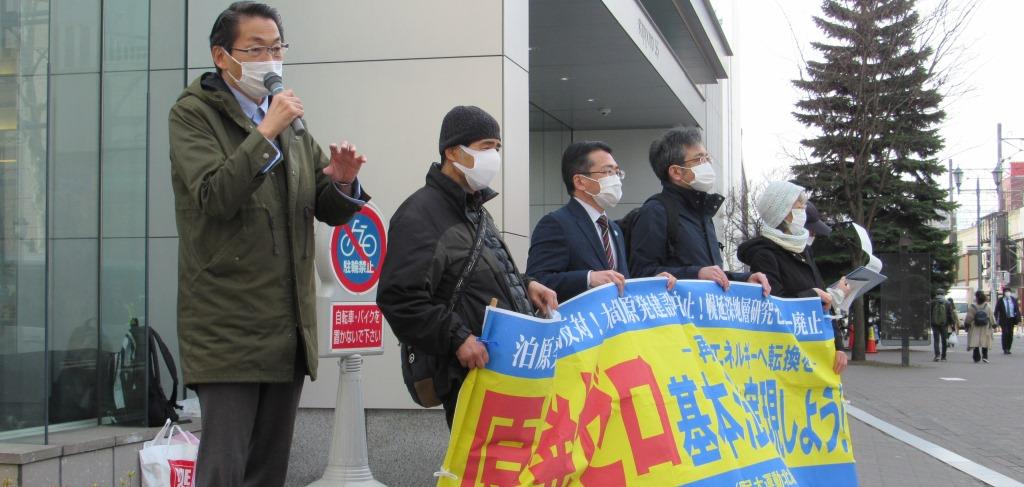 今日は道原発連の定例宣伝の日。菅政権は明日にも、福島第一原発事故での放射性物質トリチウムを含む「処理水」=汚染水を、人体に影響がないレベルにまで薄めて徐々に海洋放出する閣議決定をおこなうとしています。試験操業から本格操業へと向かおうとしている漁業者にとって、当然許されないもの。梶山経産相は「風評被害は当然起こる。対策に万全を期す」と述べていますが、海洋放出しないことこそ最大の風評被害対策です。