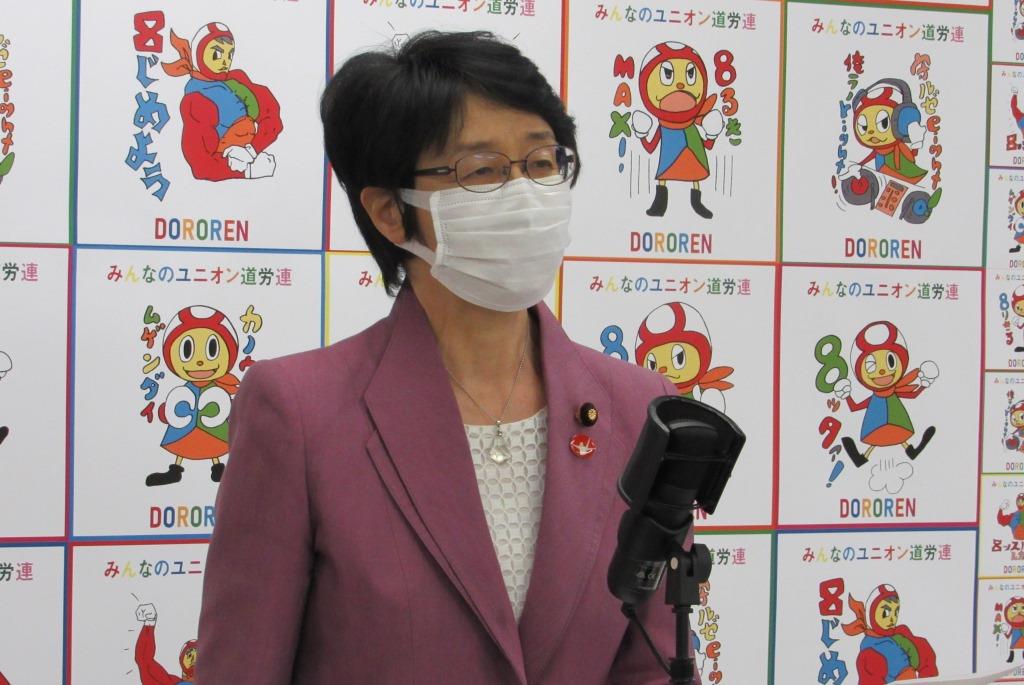 北海道では、夕張市でマルハニチロや夕張リゾート、釧路市では日本製紙などで閉鎖・撤退などが起きました。職を失った労働者が途方にくれることがないようにと、私も現地へ足を運びました。「コロナ禍だから仕方ない」でとどまりたくないし、自己責任で何とかしろと突き放すような政治をも容認したくない。困難が続く今だからこそ、労働組合が必要です。共同・共闘の力で、何としても政権交代へと道を開かねば。集まれなくても心ひとつに、いっしょに私もがんばります。