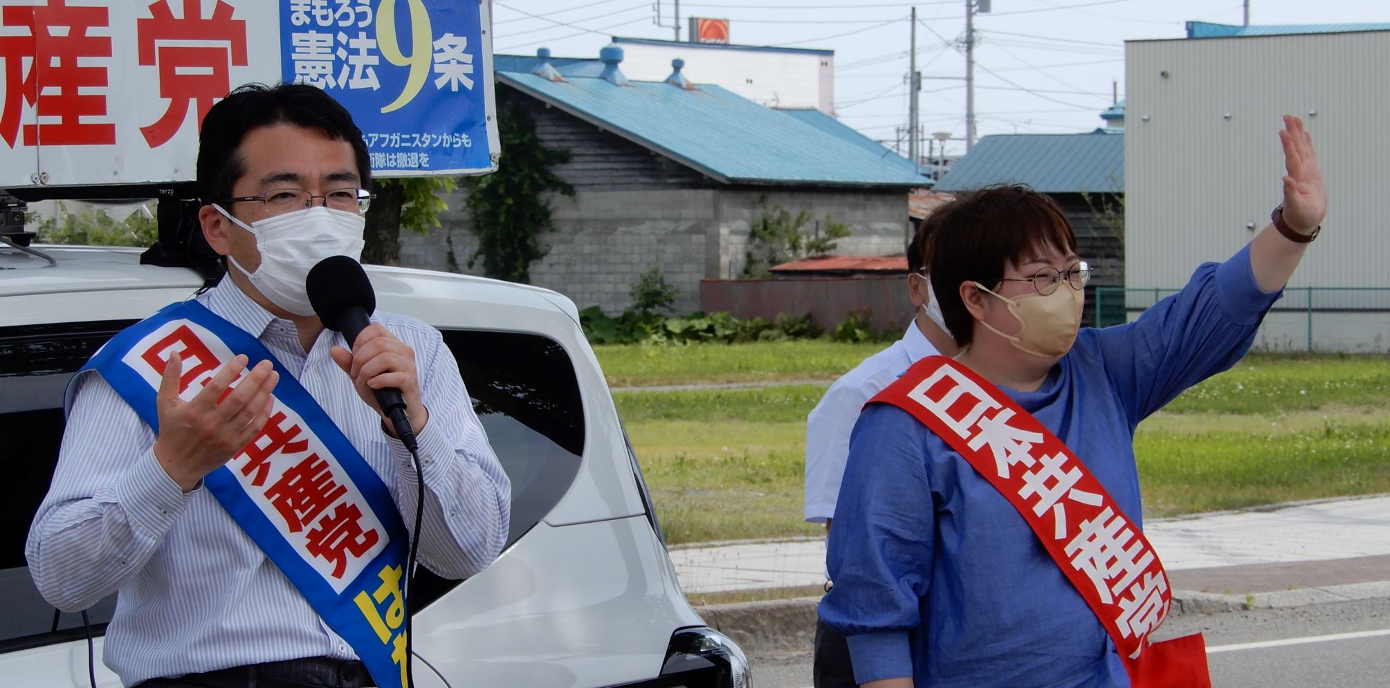 日高町の「集い」ではワクチン接種や東京五輪が話題になり、参加された方のリクエストで全員での記念撮影も。各地でトマト・トマトジュース・缶ジュースなどが次々と差し入れられて、ひしひしと期待も感じました。新冠町では風が強いなかでも支持者の方が日本共産党の旗を持ち続けてくださり、新ひだか町では選挙本番かと思うくらい演説箇所に足を運んでくださっていて、その勢いからか買い物途中の方も足を止めるなど注目が集まりました。