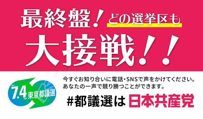 明日が東京都議選の投票日。どの選挙区も大激戦・大接戦です。日本共産党候補への支持を広げるため、今日の時間いっぱい、ご協力ください。政策や候補者などはこちら、SNSで拡散するときはこちらもご覧ください。