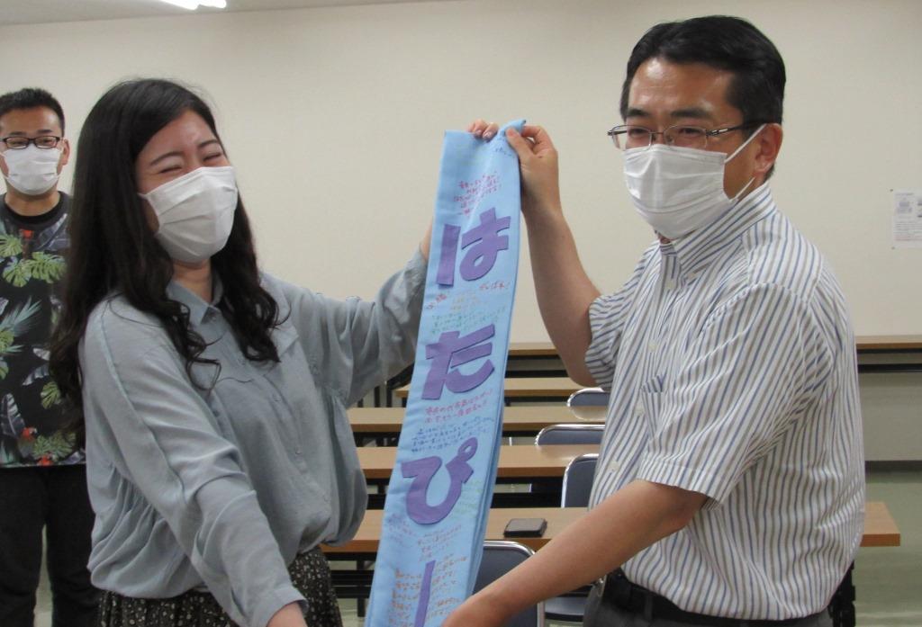 そういうわけでオンライン集会も途中で抜けたのですが、部屋を出る直前に「はたやまさんにプレゼントがあります」と手渡されたのは、何と寄せ書き入りのタスキ! 学生時代のころに呼ばれていた「はたぴー」のタスキを30年前の自分が見ていたら、何と思うでしょうか。