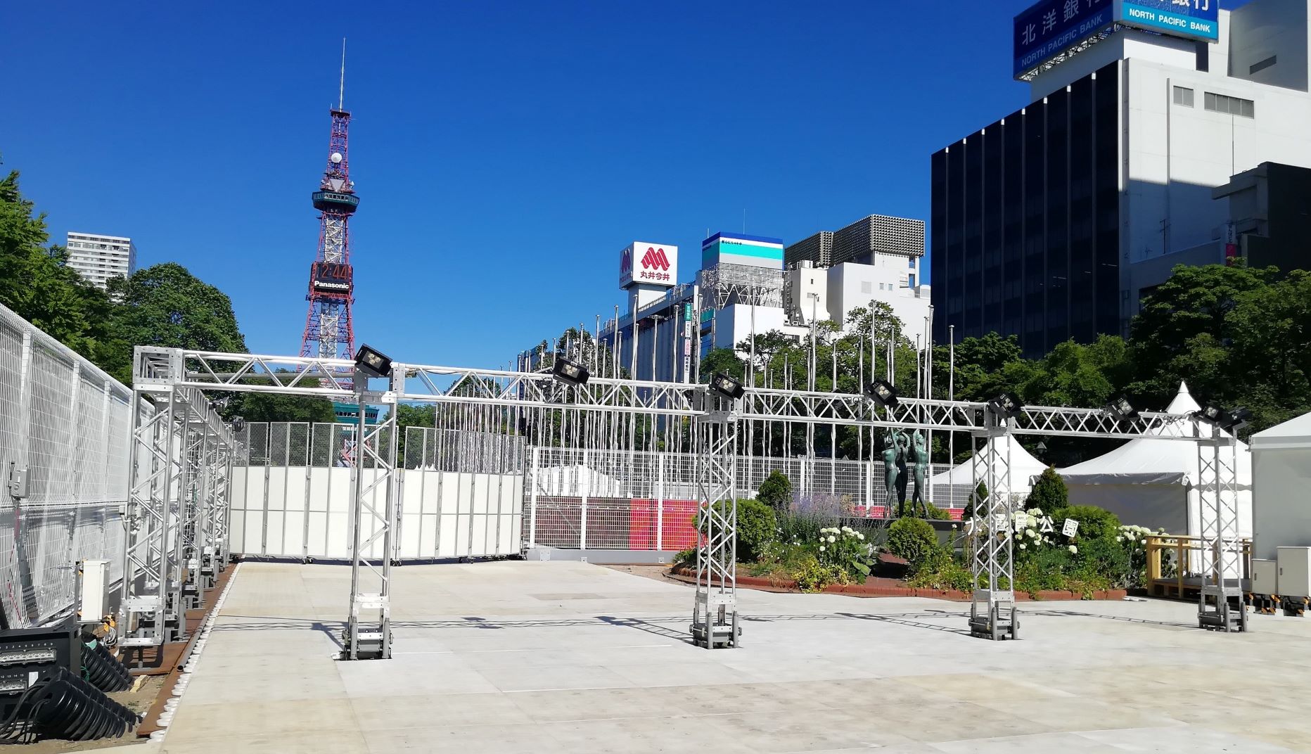 何本も並んでいるポールは参加国の国旗を掲揚するものでしょうか。この時期の大通公園なら、仕事を一休みしている方、噴水で遊ぶ子どもたち、散歩や観光に来られている方々、ビアガーデンも始まって相当にぎわっていたはず。しかし今日は、中心街の会場にもかかわらず人の姿が見えないために、かえって異質な雰囲気を受けたのです。