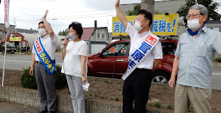 遠軽町に移動し、10月3日投開票の町議選挙へ挑む戸松(とまつ)恵子さん・岩沢武征町議と合流して街頭演説にまわりました。岩沢さんからのバトンタッチをめざす戸松さんは、養護教諭を長く勤めて一昨年、退職されたばかり。子どもたちへ向けた愛情の目を、今度は全町民に向けて政治の道を歩みます。国政とともに地域で根を張って活動する仲間がいるのは、日本共産党だからこそ。偶然に見かけたという戸松さんの知人も「がんばって」と激励されていきました。