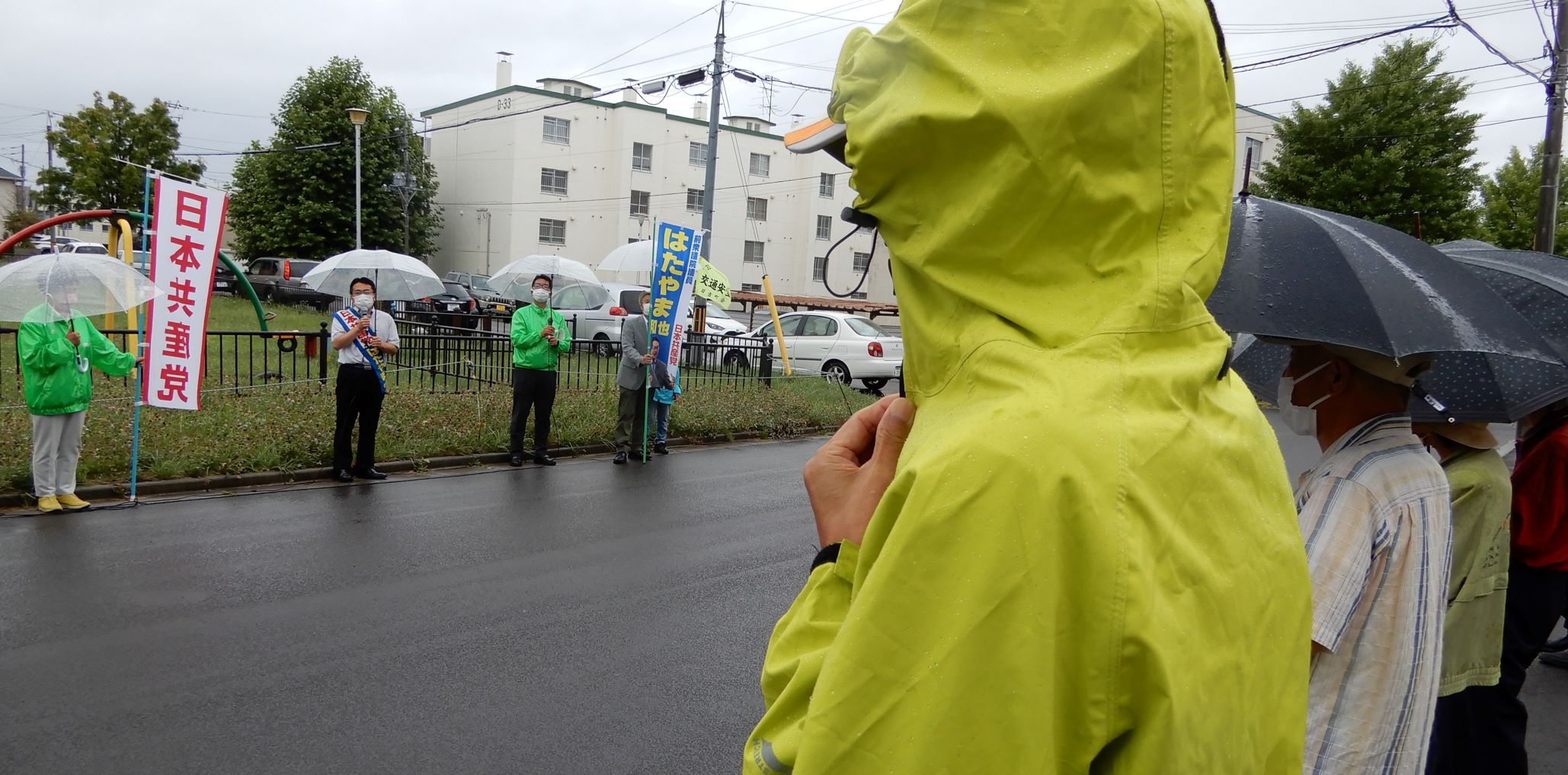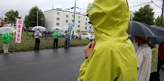 雨の函館でしたが、市内各地の街頭演説には党員・後援会員が駆けつけてくださり、ありがたい限り。いっしょに党函館市議団がまわっていただき、本間勝美・党函館地区副委員長が司会を務めました。