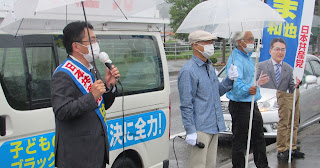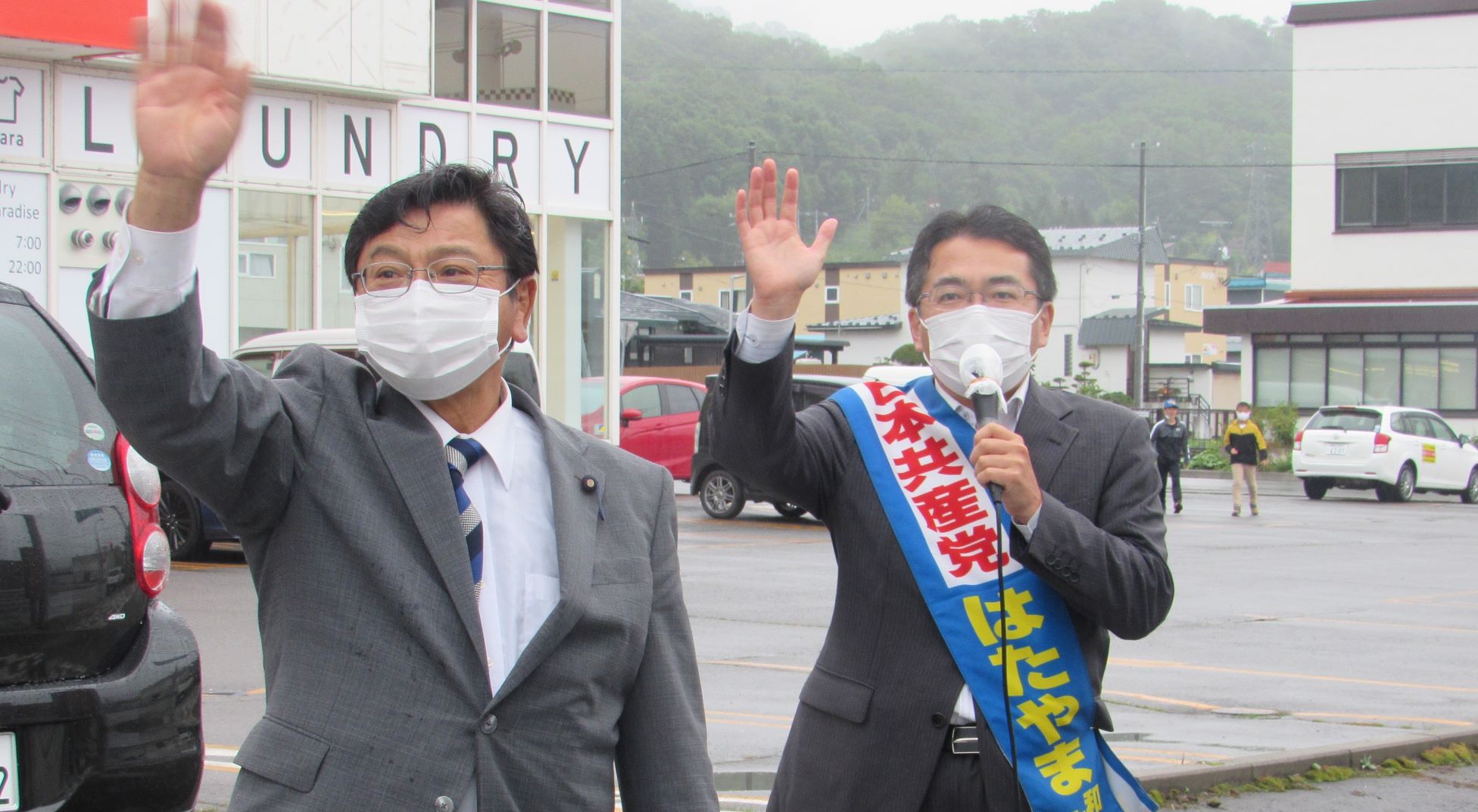本別町では雨も上がり始め、阿保静夫町議との街頭演説に「がんばって」と車の窓を開けての激励も。他にも激励を受けたのですが、阿保町議も知らない方だったそうです。励みになりました。