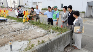 薬液を注入して地盤強化した宅地も見させていただきました(写真)。薬液がゼリー状の球体に固まって、地盤の流動化を防げるといいます。問題はこの後で、被災者生活再建支援制度はあるものの、新たな家を建てるには自己資金が必要です。「この地域は高齢者も多いので、新たな住宅ローンを組むのは現実的に厳しい」との盛田さんの言葉が胸に刺さります。