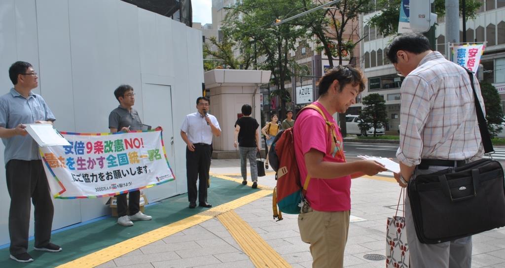 台風による被害と暑さ、大丈夫でしょうか。北海道も各地と同様、札幌も30℃を超えるなか「9の日」行動。暑かった。憲法改悪反対共同センターが定期的におこなっている宣伝で、道労連の三上議長などといっしょに私もマイクを握りました。「私も医労連に入ってるよ」と署名された方や、宣伝後に「署名してもいいですか」と駆け寄ってこられる方もいました。安倍政権の状況に何かしなければと、もぞもぞしている方は多くいると思うのです。