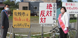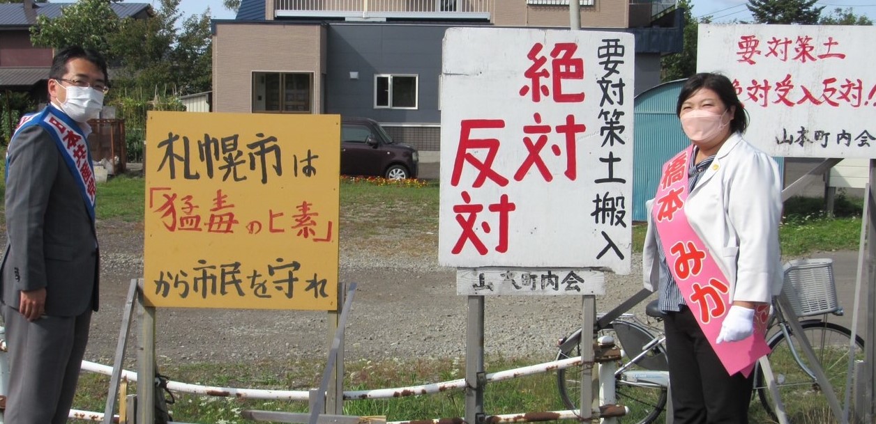 山本地域は道路沿いに、写真のような反対看板がズラリ。過去には地下鉄工事から出た残土置き場、今は冬に排雪置き場ともなっている同地域。「これまでも札幌市に協力してきたが、今回ばかりは受け入れられない」と声があがり、日本共産党も橋本みか予定候補や村上仁市議が懇談を重ね、国会では紙智子参議院議員が質問をし、住民合意が必要であると国交相の答弁も引き出しました。