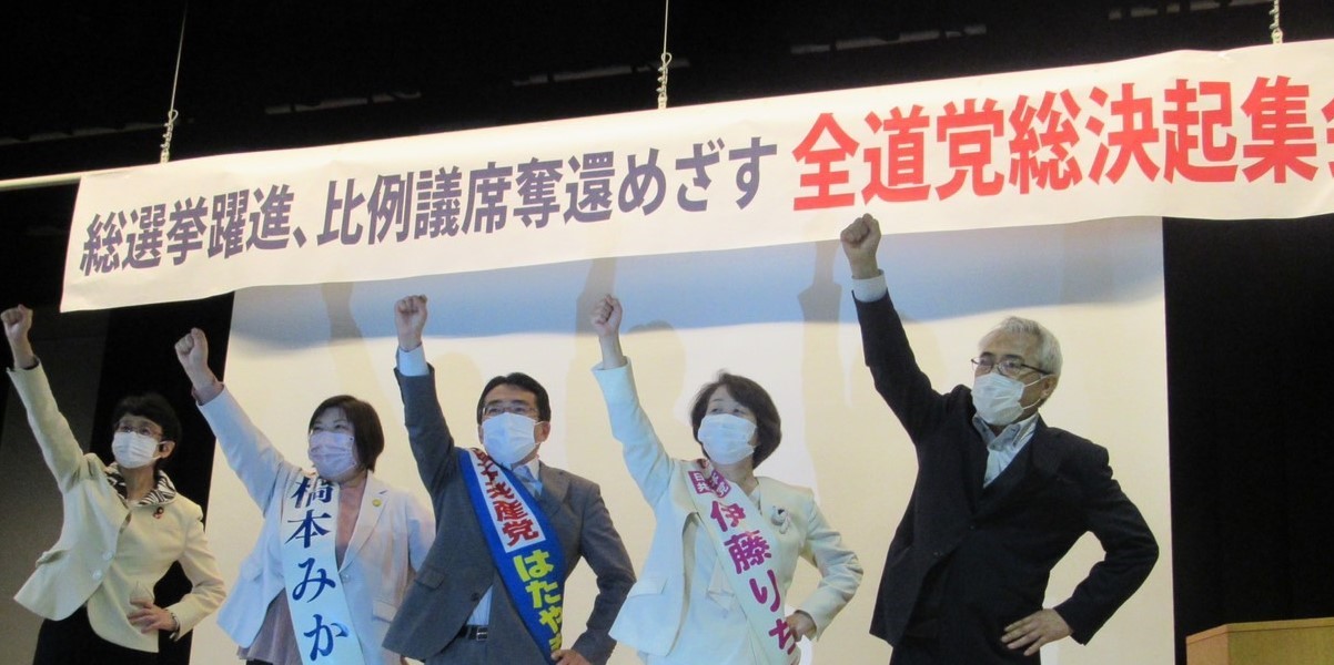 全道党組織による決起集会で、あらためて小選挙区の予定候補と私から決意表明。どの予定候補も、これだけの苦難に直面してきただけに、訴えにも力が入っていました。もちろん私も必ず比例議席の奪還と、政権交代をと力を込めました。最後は会場の参加者とともに、オンラインで結んだ全道の仲間と「団結がんばろう」。