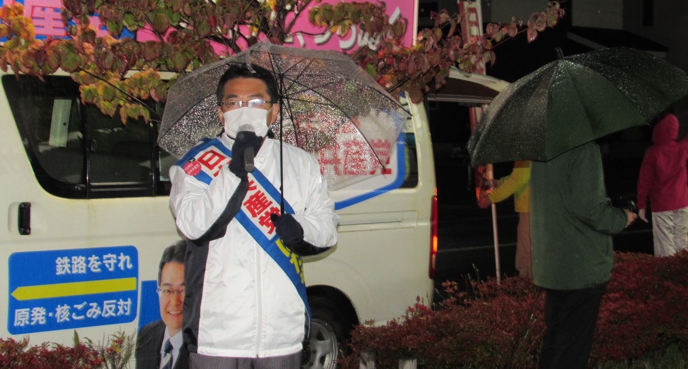 函館市での第一声にも多くの方が駆けつけて、「がんばろうね」と声をかけてくださる笑顔が本当にあたたかい。途中から雨にもあたりましたが、負けない勢いで訴え続けました。家のカーテンを開けて、子どもと演説を最後まで話を聞いてくださった母親がいたのですが、地元の党員・後援会員の誰もつながりのない方だとか。