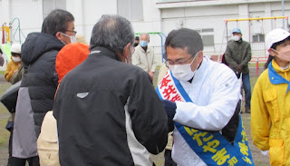 鉄の町・室蘭市の朝はいつも早く、工場門前でのあいさつから。窓を開けて手を降る方の姿もあり、励まされます。その後は登別市・白老町・苫小牧市・千歳市で訴えました。