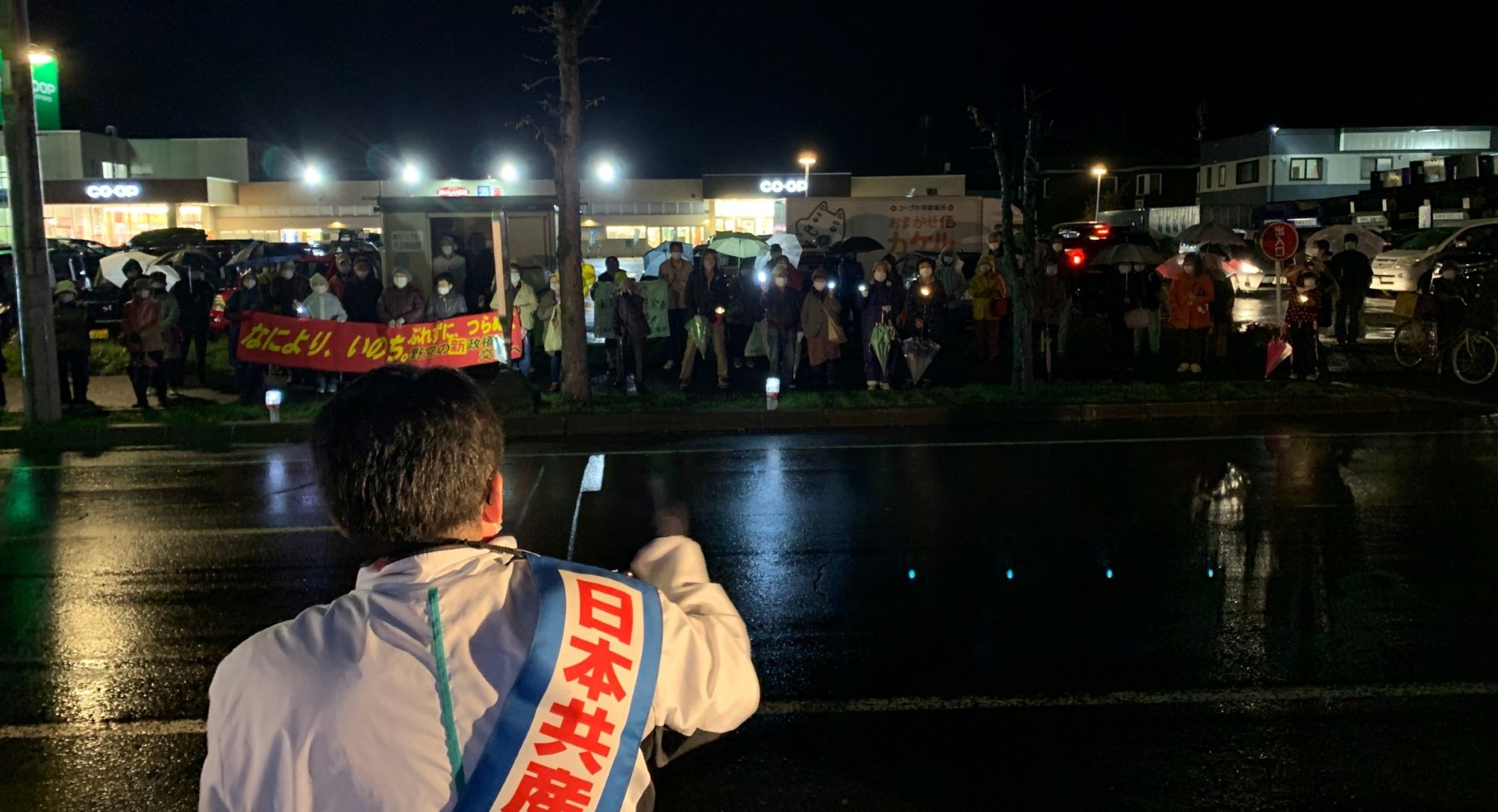 すっかり暗い余市町ではライトの準備までいただき、エールの声も大きい! 支えられているありがたさを胸に、明日も元気に訴えます。