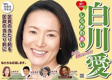 キャッチフレーズ:「母の勇気が区政を動かす」「私はひとつまみの塩になりたい I want to be a pinch of salt.」
