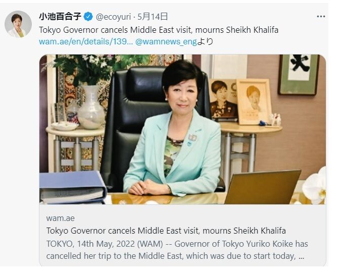 小池都知事、UAE出張から帰国 前大統領逝去で弔問 日経新聞