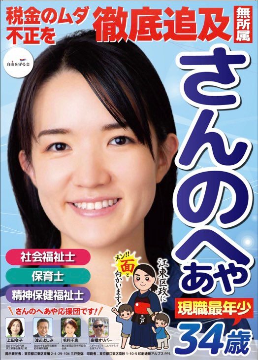 各地域の有権者の皆様におかれましては、令和最初の統一地方選挙にあたり、少数精鋭でしがらみなく動き成果を出して来た地域政党自由を守る会候補者に自由の一票を投じて頂きたく、重ねてお願い申し上げます。